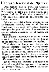 “…hubo un sello de combatividad que obligó a luchar desde el principio… La prueba está en la derrota de Bordell en la primera ronda (contra el Dr. Vallvé), que le ocasionó la marcha forzada del Torneo, sin lograr acabar de recuperarse. También es significativo el que en la última ronda se dirimieran los primeros puestos con las partidas Albareda-Pomar y Bordell-Golmayo, ambas terminaron en tablas… Mientras que Albareda se dedicó a contener a sus adversarios para hacerse con el primer premio, ofrecido por Malvasía-Robert, lo que consiguió con la facilidad de gran maestro que le distingue. El segundo y tercer lugar se lo adjudicaron al unísono Golmayo, Cherta y Pomar, siendo de destacar la magnífica actuación de Cherta, quién al igual que Golmayo y Albareda, logró mantenerse imbatido. Tanto Pomar como Bordell sólo perdieron una partida, lo que fue suficiente para alejarse del primer puesto. Nuestro campeón, Bordell (entonces era el vigente campeón de Catalunya), derrotó una vez más al excampeón de España, Arturito Pomar, victoria que por sí sola acredita las esperanzas que en nuestro jugador se habían puesto para este torneo. Cumplió muy bien el Dr. Vallvé, y Sanz se mostró poco acertado. Los jugadores locales y el Dr. Mena ayudaron a que el torneo constituyera un éxito, el cual no podemos silenciar que corresponde por completo a los abnegados suburenses Joan Corella y Enric Almiñana, en su calidad de presidente y secretario, respectivamente, del comité organizador. Gracias a los desvelos de estos dos entusiastas aficionados y a la eficaz colaboración del excelentísimo Ayuntamiento de la villa y del Casino Prado Suburense, fue posible alcanzar el éxito logrado, lo cual les anima para celebrar el próximo año el Segundo Gran Torneo Internacional (como así sucedió) del rango del celebrado en 1934 (del que he puesto un enlace al principio de esta crónica) y que nos afirmaron llegará a ser una realidad (tal como habéis visto el enlace al principio) y no dudamos en creerlo si se lo proponen…”